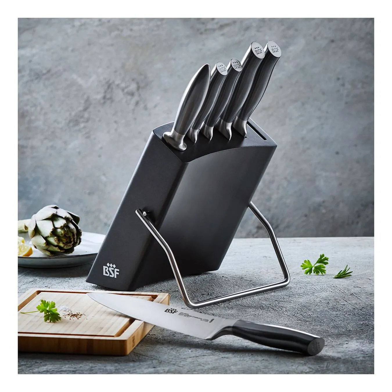 - Enthält 1 Spick- und Garniermesser (9 cm), 1 Universalmesser (13 cm), 1 Fleischmesser (16 cm), 1 Kochmesser (20 cm), 1 Brotmesser (20 cm), 1 Wetzstahl, 1 Block