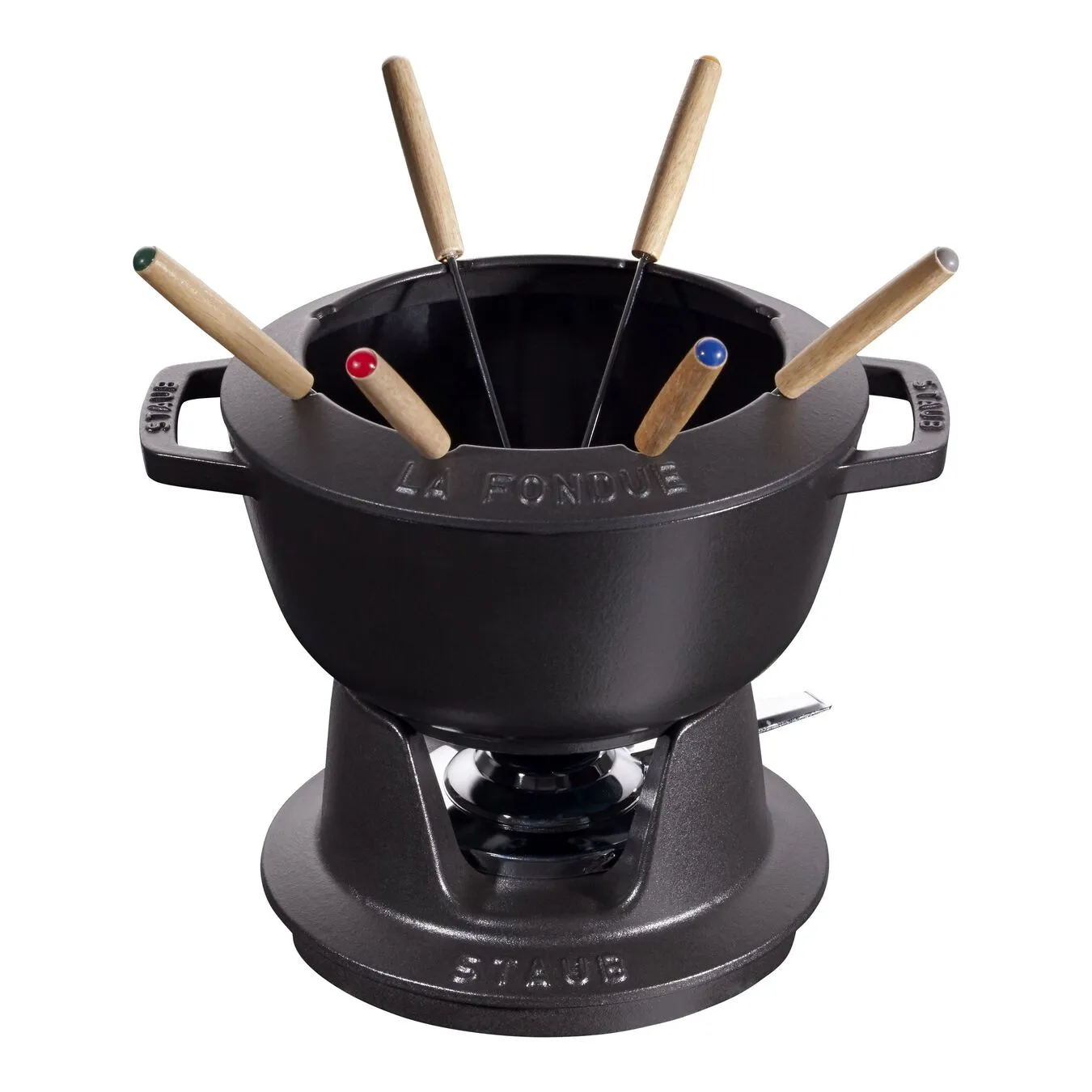 Das Fondue-Set von STAUB kombiniert eine klassische Zubereitungsform mit den Vorteilen von robustem Gusseisen. Traditionelles Gemüse- oder Fleischfondue in Öl oder Brühe, Schweizer Käsefondue mit trockenem Weißwein, Dessert-Fondue mit geschmolzener Schokolade oder feines Fischfondue – der Fantasie sind keine Grenzen gesetzt. Durch die ausgezeichnete Wärmespeicherung von Gusseisen erhitzt die Garflüssigkeit schnell, gleichmäßig und bleibt auch lange warm. Wenn der Topf auf dem Herd anstatt über dem Rechaud erwärmt wird, kann er mit Topflappen an den ergonomischen Griffen einwandfrei transportiert und auf einer geeigneten Unterlage auf dem Esstisch präsentiert werden. Die abnehmbare Gabelhalterung schützt gleichzeitig vor Ölspritzern auf dem Tisch oder der Kleidung. Dank der glatten, emaillierten Innenfläche bleibt das Gargut nicht haften und sämtliche Rückstände lassen sich leicht entfernen. Schließlich kann der Rechaud kopfüber im Topf untergebracht und das Set so platzsparend verstaut werden.