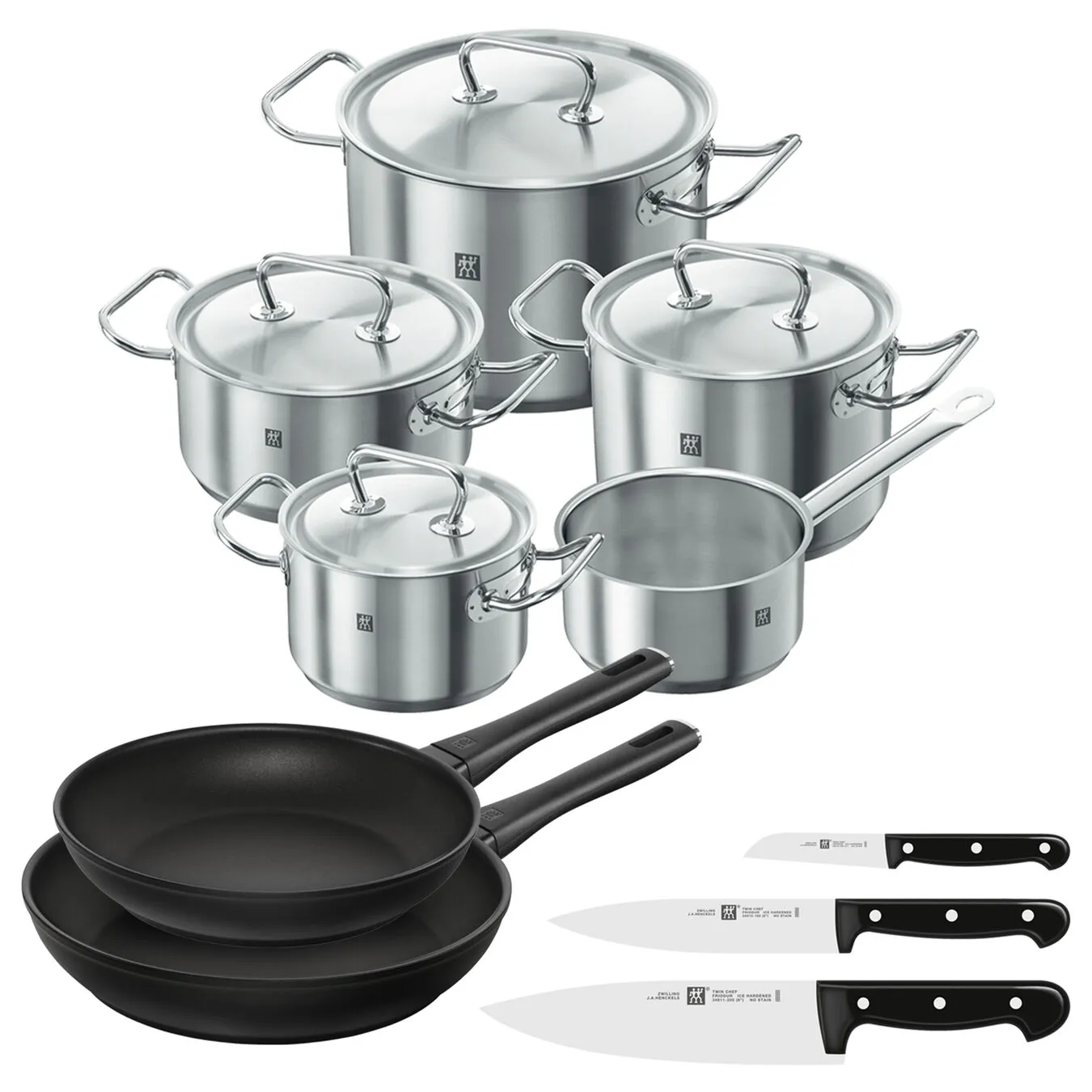 Das 10-teilige Kochgeschirr- und Messerset lässt keinen Wunsch des stilbewussten Hobby- und Profikochs offen. Es besteht aus einem 5-teiligen Kochgeschirrset der Serie TWIN Classic, zwei Bratpfannen der Zwilling Madura Plus Serie welche von Mattheo Thun & Antonio Rodriguez designed wurde und aus einem 3-teiligen Messerset der TWIN Chef Serie.